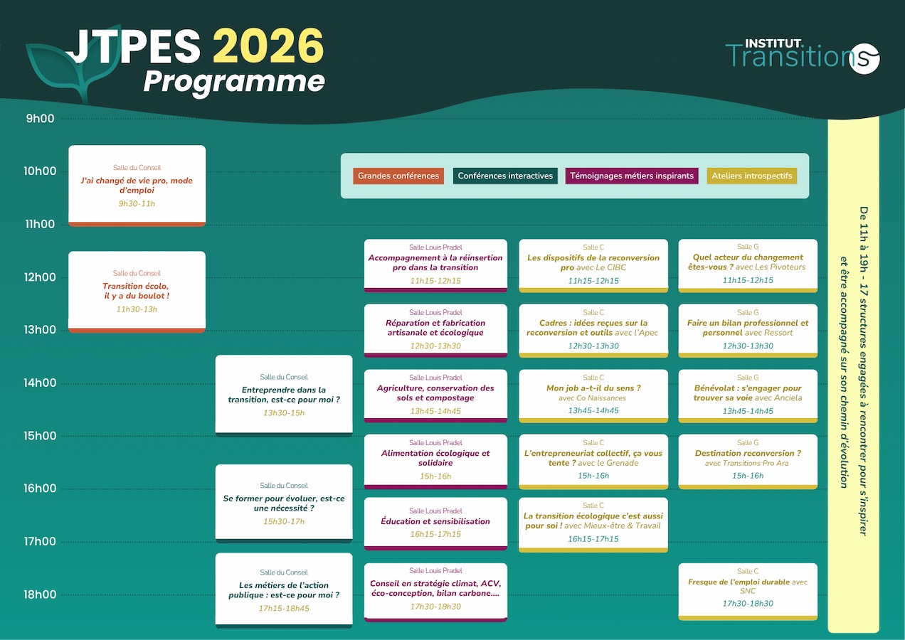 Si des activités auxquelles vous souhaitiez participer sont complètes, n’hésitez pas à venir faire un tour sur notre Archipel des Solutions où de nombreux acteurs de la transition pro seront là pour vous guider dans votre cheminement de changement de vie professionnelle.